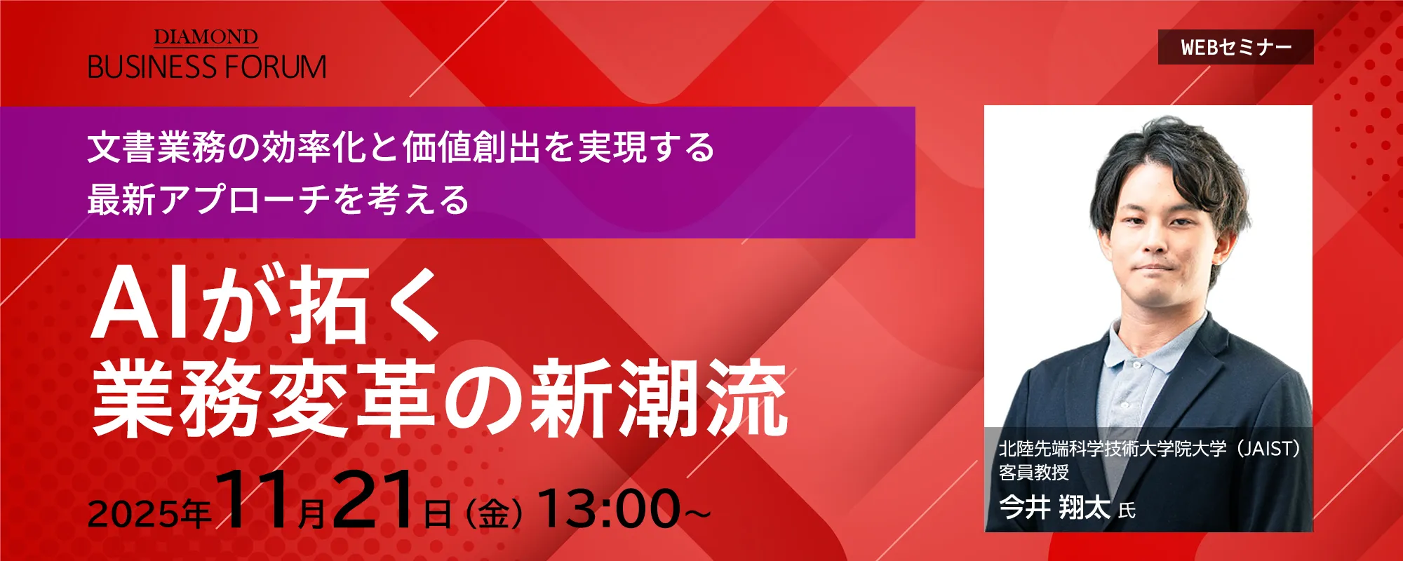 本イベントでは、AI活用の現状から最新動向までを幅広く解説し、企業がAIによって実現できる業務効率化や生産性向上、さらにそれらを部門や企業全体の成長へとつなげるための方法を、実践的な事例を交えながら紹介します。すぐに実践できる具体的なアクションプランも提示し、2026年に企業が大きく飛躍するためのエッセンスを提供します。