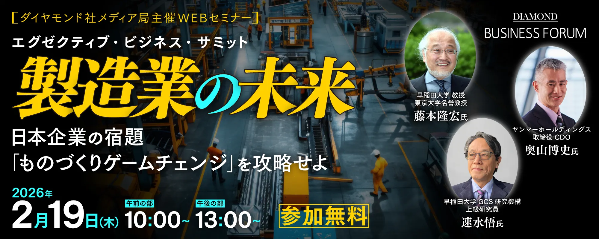 本セミナーでは、日本の製造業の強みを再確認し、製造業に突きつけられた宿題である「ものづくりゲームチェンジ」をいかに攻略し未来を切り拓くべきか、そして不確実な時代における製造業のDXの本質について探っていきます。